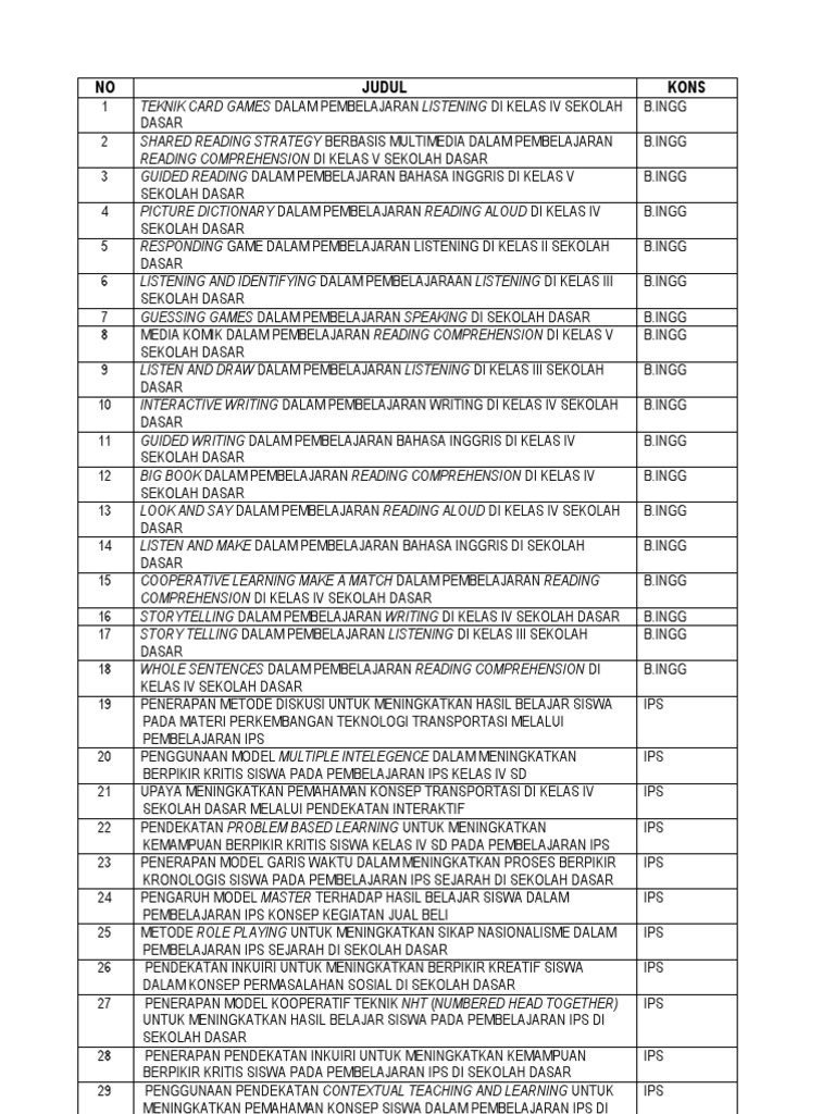 Judul Skripsi Non Ptk Pgsd : Judul Skripsi Pgsd S1 Non Ptk - Kumpulan Berbagai Skripsi / Daftar 150 judul skripsi pgsd praktek tindakan kelas (ptk) terbaru mudah dikerjakan.. Contoh skripsi ptk tesis makalah review ebooks. Contoh penelitian tindakan kelas (ptk) sekolah dasar (sd via. Bagi yang akan memesan, rincian judul contoh ptk sd (judul nomor 1 s/d 55) ditambah dengan bonus 98 file contoh judul skripsi pgsd lainnya yang bukan judul ptk sd (judul nomor 56 s/d 153) yang juga telah kami siapkan file lengkapnya untuk dipesan (dari halaman judul sampai daftar. Daftar 150 contoh judul skripsi pgsd berikut ini kami berbagi kepada para pembaca khususnya mahasiswa (i) yang sudah merencanakan untuk mengajukan judul. Dikarenakan judul skripsi pgsd ini banyak, saya akan memberikan yang mudah dikerjakan dan mengelompokan judul skripsi agar mudah anda lihat.