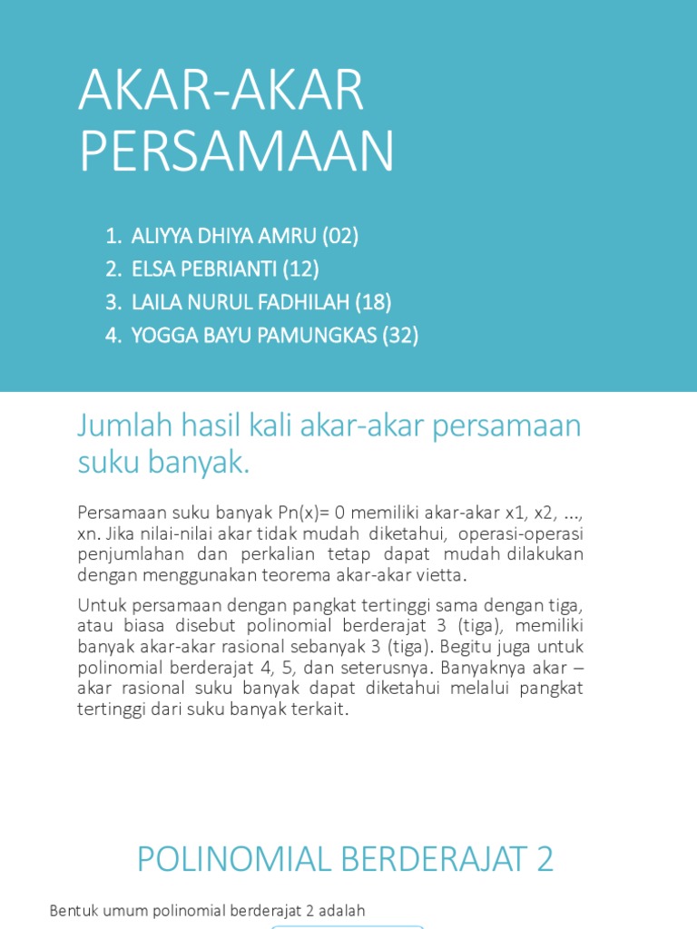 Terima kasih atas komentar yang telah anda berikan. Sifat akar akar suku banyak. Jumlah, selisih dan hasil kali akar. Baiklah, untuk lebih jelasnya anda simak contoh 2: Ini tak semudah menentukan persamaan kuadrat… tetapi bisa menggunakan beberapa berikut ini : Akarnya, dan jumlah koefisien dan konstantanya semuanya sama. Berikut adalah beberapa bentuk yang tidak termasuk ke dalam bentuk polinomial. Masih mau dan nggak bosan belajar math?? Slamat datang di blog paling bermanfaat sedunia. Persamaan dan pertidaksamaan nilai mutlak linier satu variabel. Diketahui persamaan kuadrat jika salah satu akarnya empat kali akar yang. Belajar jumlah & hasil kali akar suku banyak dengan video dan kuis interaktif. 6 dan di bagian aljabar kita lihat titiknya adalah seperti ini.